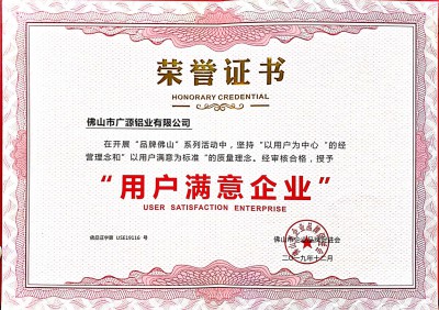 用戶滿意企業(yè) 榮譽證書